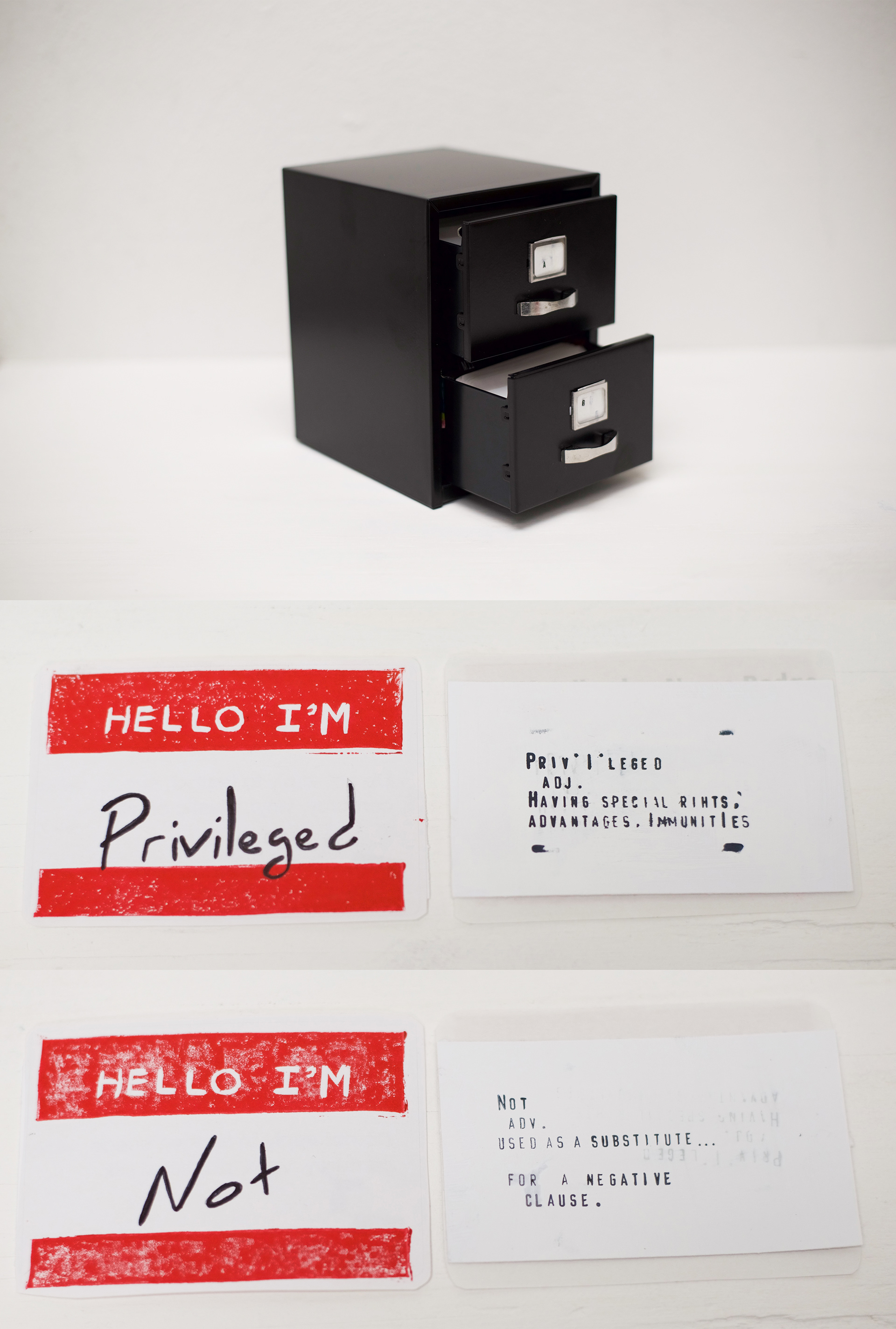 Hello I'm is an interactive social sculpture that prompts viewers to approach the file cabinet and select a name tag according to their ethnicity. If the participant is of European descent they are to select the name tag from drawer 'A', and participants from "othered" ethnicity are invited to select a name tag from drawer 'B'. This piece engages with the binary nature of race in the United States and how privilege may be ascribed according to one's ethnic background. One's ability to simply select from a drawer is more complicated if they are of mixed heritage. The participant ultimately is given many choices, to choose, to ascribe, to wear their privilege or lack of privilege.